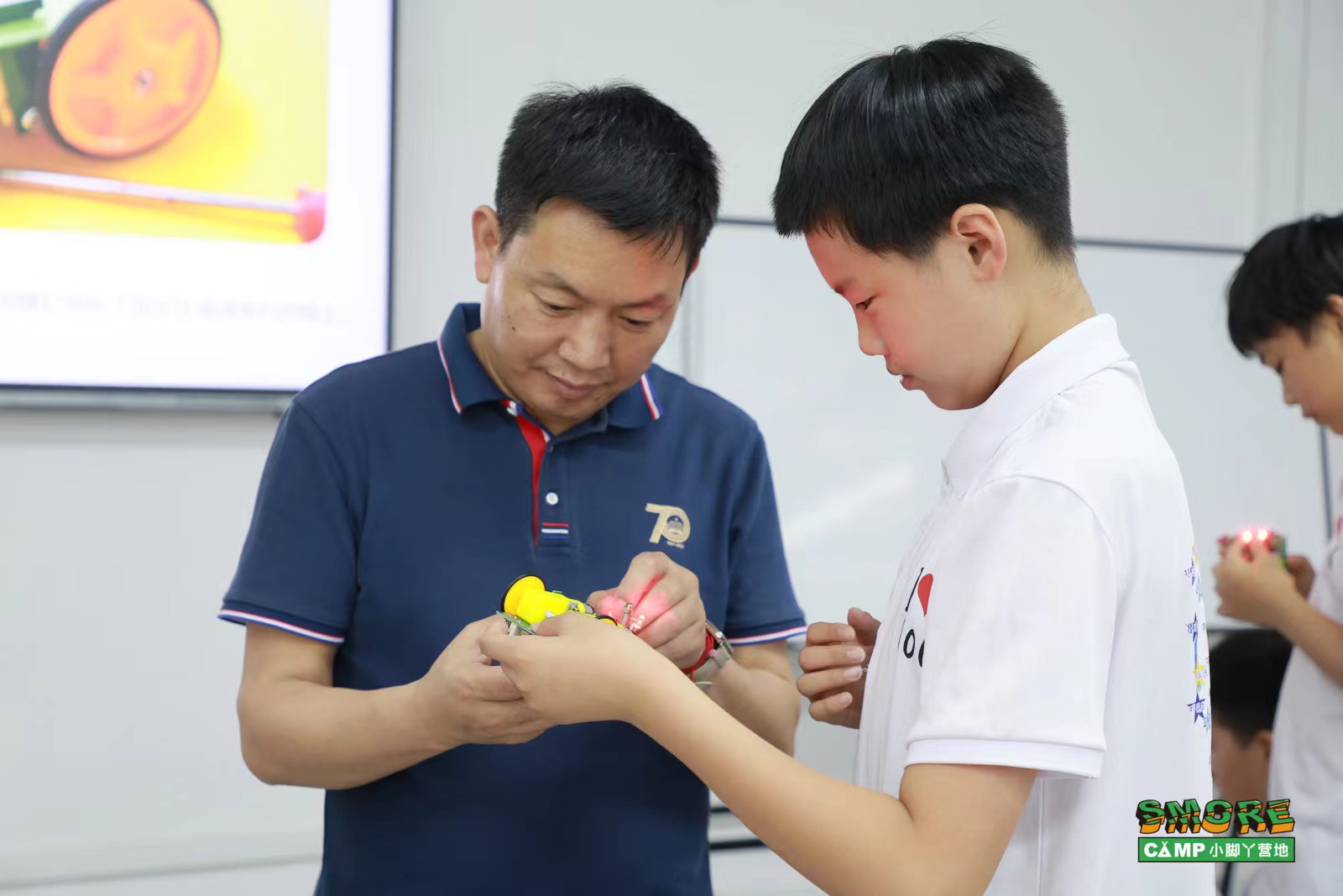 接着,就是小朋友翘首以盼的动手实验:《循迹智能车原理探究与制作》,首先,夏景圆老师通过PPT给小朋友讲解了循迹智能车的基本原理和制作过程,以及组装循迹小车的注意事项。活动开始后,同学们根据老师的指导与组装教程,很快就从认识组件过渡到组装环节中。在这一环节,每位同学都成功组装出循迹小车。最后,为了确保循迹小车不仅能动起来,更要跑起来,同学们细心在轨道上进行调试。当小车正常循迹跑动时,小朋友们一个个欢呼雀跃。