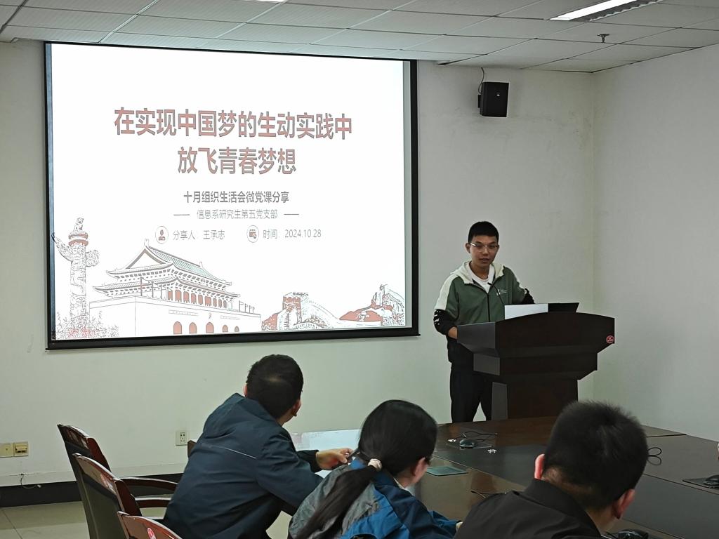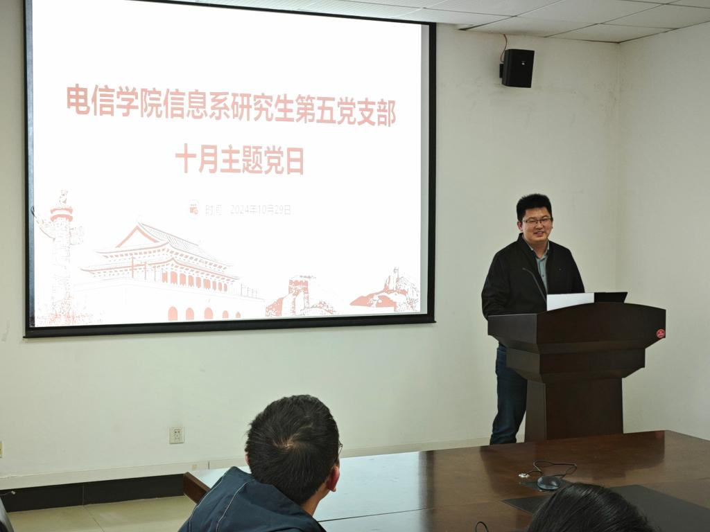 10月29日下午,bat365在线登录入口党委书记葛茜参加信息系研究生第五党支部主题党日活动并讲授党课,学院党委副书记陈世英、辅导员史师帅,支部全体党员及入党积极分子参加。