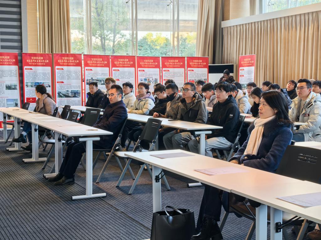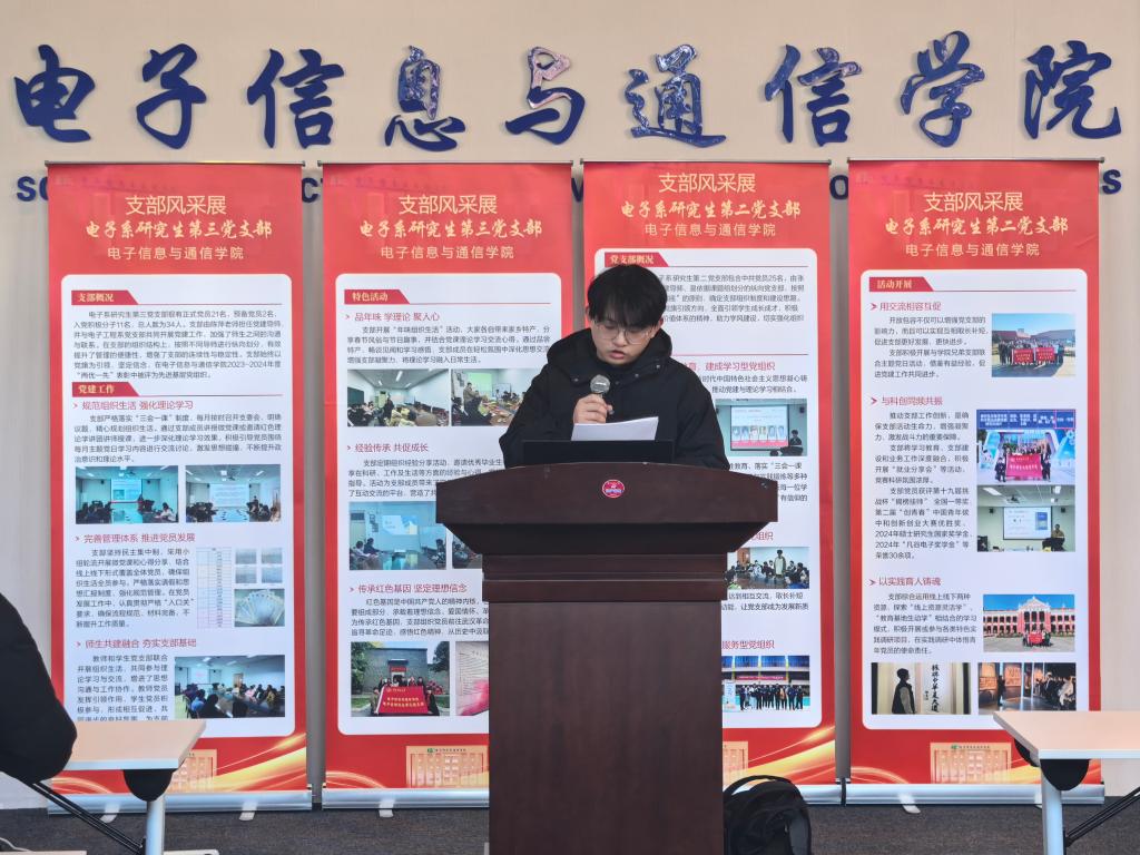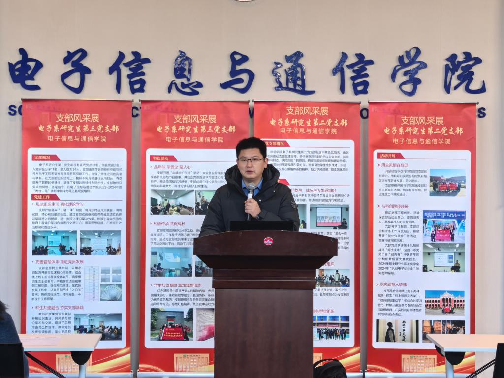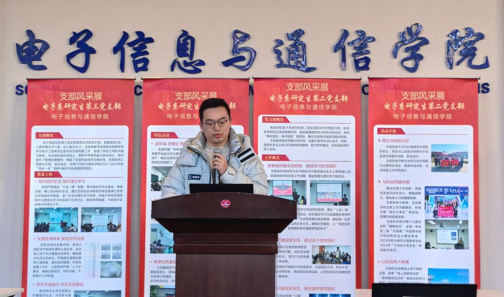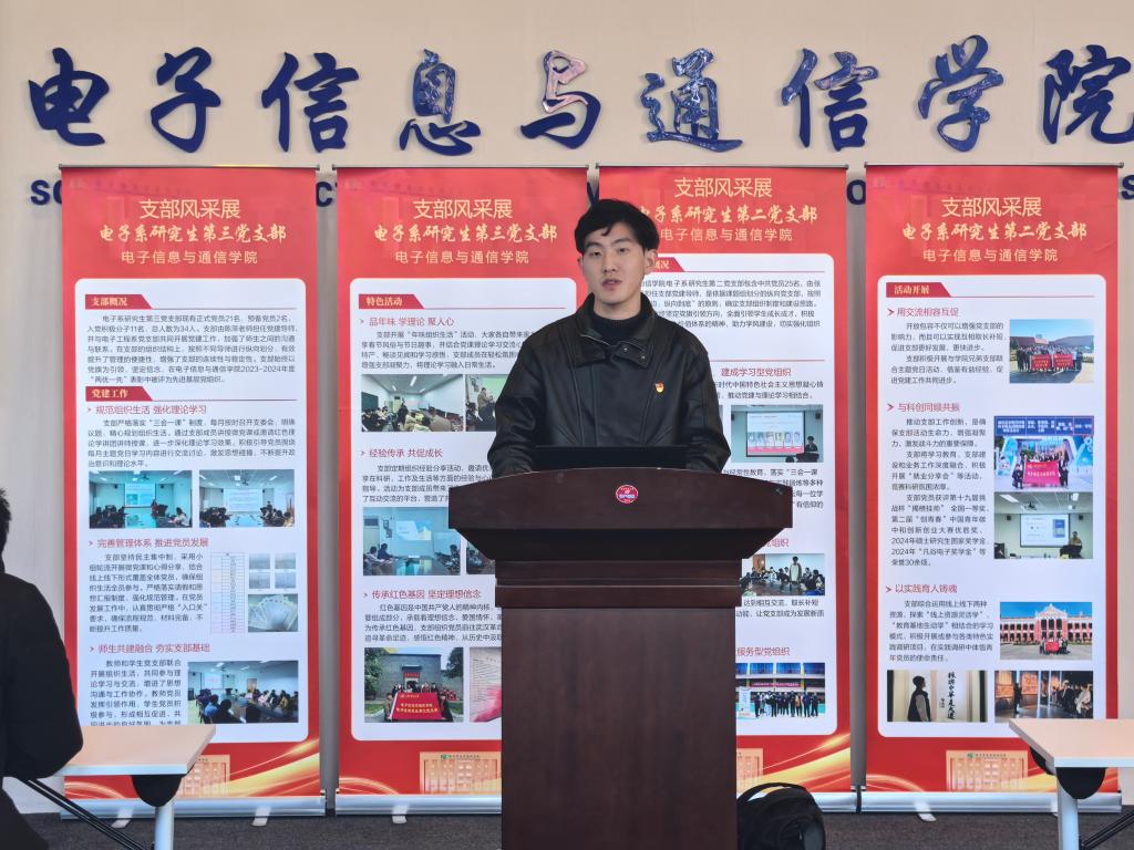 会议伊始,陈世英上台致辞。他首先对过去一年研究生党建工作给予肯定。他指出,学院实施研究生纵向党支部和党建导师制度以来,各支部在党建导师的指导下,结合支部特色,开展了一系列富有成效的工作。2024年,在党建的引领下,我院研究生在科研、实践以及文体等方面取得了一系列丰硕的成果,党建的引领力进一步增强,党建的龙头作用进一步彰显。他期望各研究生党支部能够充分发挥自身特色,紧紧围绕服务科研主业,切实发挥党支部的战斗堡垒作用。同时,他希望大家借助此次支部风采展和支部述职的契机,互学互鉴,共同进步,进一步激发支部活力,更好地发挥支部的引领作用。