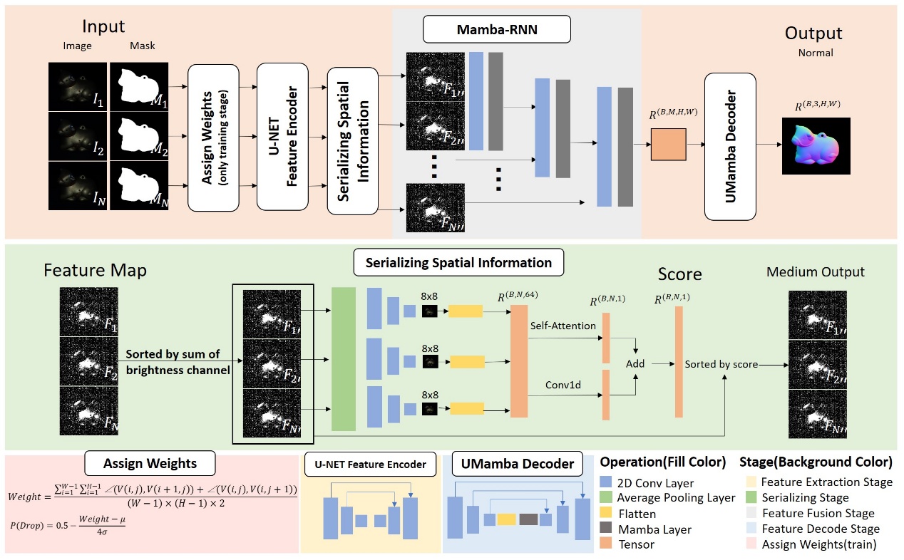针对这一问题,徐敏哲同学提出一种序列化空间域信息(Serializing Spatial Information)的方法,该方法将输入的多张图像通过网络重新排序,赋予序列的信息,再将其输入到序列模型(如RNN,LSTM等),并结合新颖的Mamba模块提取图像细粒度特征,从而优化了图像间和图像内部信息的表达,取得了精度的提升。此外,该同学还提出了一种衡量光度立体任务难易程度的客观质量指标,通过该指标筛选数据集并赋予权重,使得网络训练效果得到进一步提升。